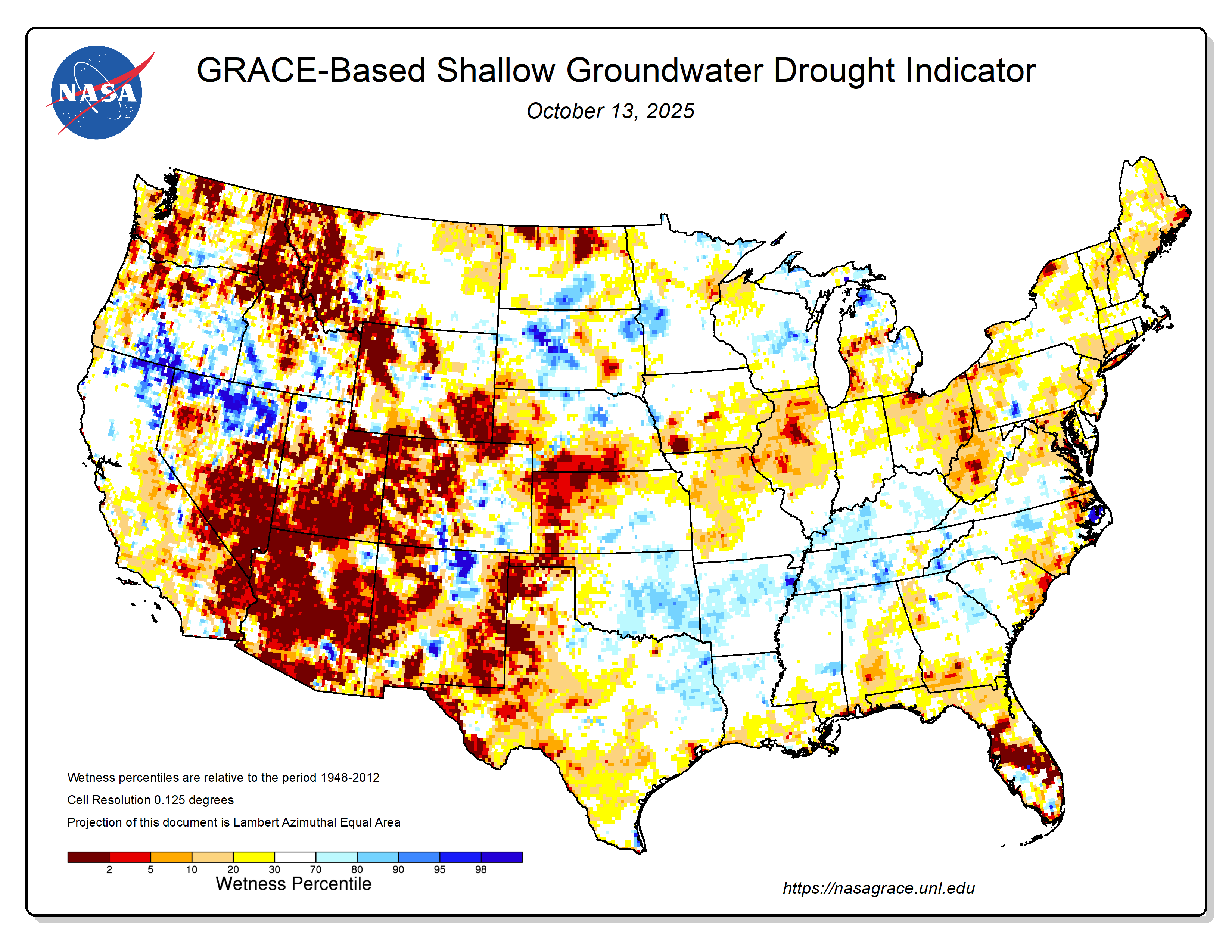 The shallow groundwater drought indicator is based on terrestrial water storage observations derived from GRACE satellite data and integrated with other observations, using a numerical model of land surface water and energy processes. The drought indicators describe current wet or dry conditions, expressed as a percentile showing the probability of occurrence within the period of record from 1948 to the present, with lower values (warm colors) meaning dryer than normal, and higher values (blues) meaning wetter than normal. For more information, please visit https://nasagrace.unl.edu/
